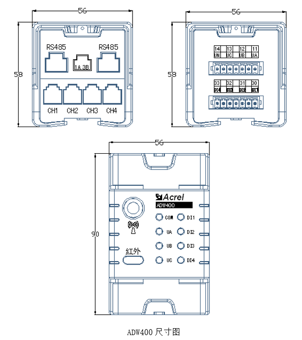 DW400環保監測模塊主要用于計量低壓網絡的三相有功電能,同時可選擇四個回路的電流輸入,具有RS485通訊和470MHz無線通訊功能,方便用戶進行用電監測、集抄和管理??伸`活安裝于配電箱內,實現對不同區域和不同負荷的分項電能計量,統計和分析。