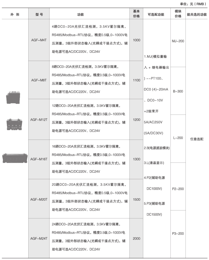 AGF-T穿孔式光伏匯流采集裝置是專門應(yīng)用于智能光伏匯流箱,用于監(jiān)測光電池陣列中電池板運行狀態(tài),組串電流測量,匯流箱中防雷器狀態(tài)采集、直流斷路器狀態(tài)采集、裝置帶有RS485接口可以把測量和采集到的數(shù)據(jù)和設(shè)備狀態(tài)上傳。
