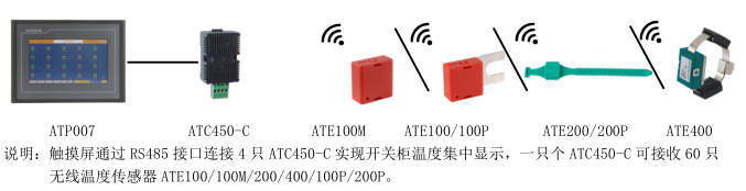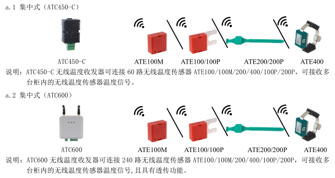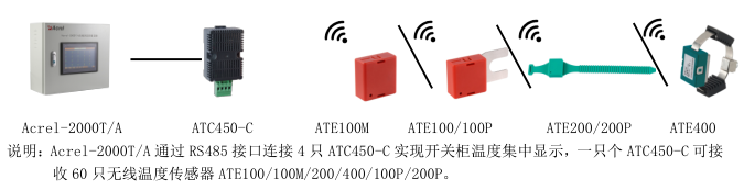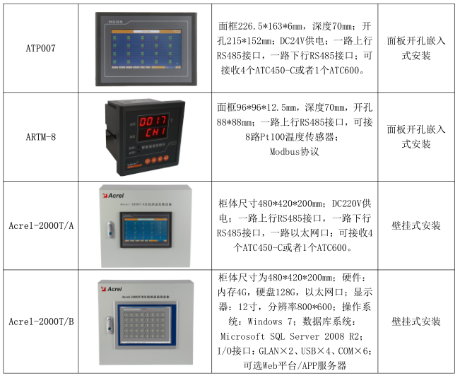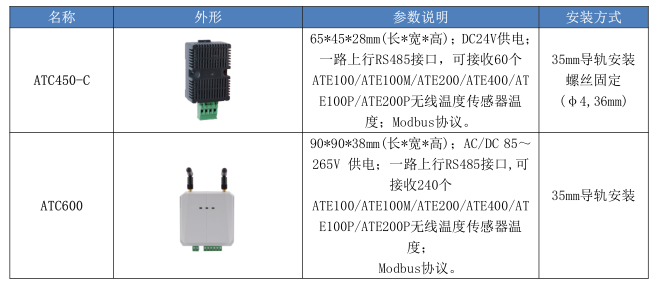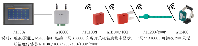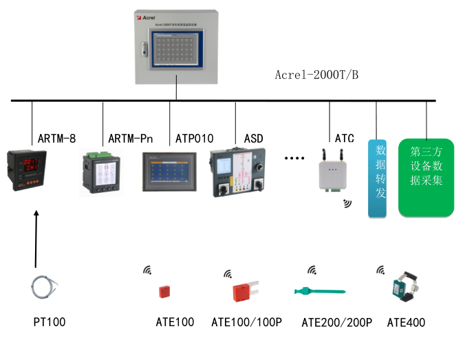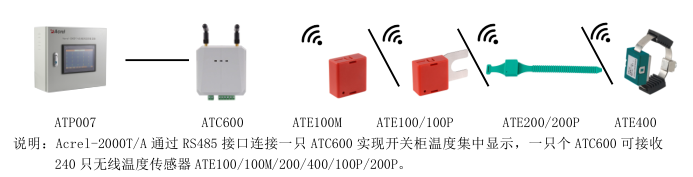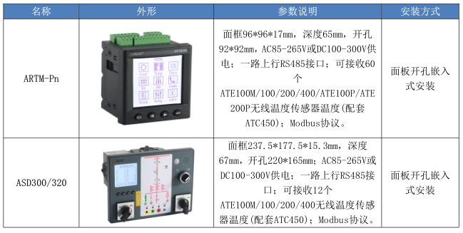 ARTM-Pn無線測溫裝置:ARTM-Pn無線測溫裝置可以單獨(dú)安裝在高壓柜、低壓抽屜柜內(nèi),每臺(tái)裝置可以接收18個(gè)傳感器的數(shù)據(jù),傳感器型號(hào)可選配ATE100、ATE200、ATE300。裝置帶有一路485接口,可將采集到的溫度數(shù)據(jù)上傳到監(jiān)控中心。