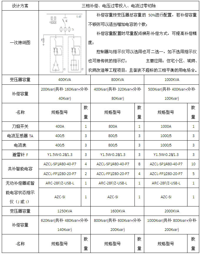 1、變壓器容量為400/800/1000/1250/1600/2000KVA的三相補償應用方案(串接7%電抗器)。