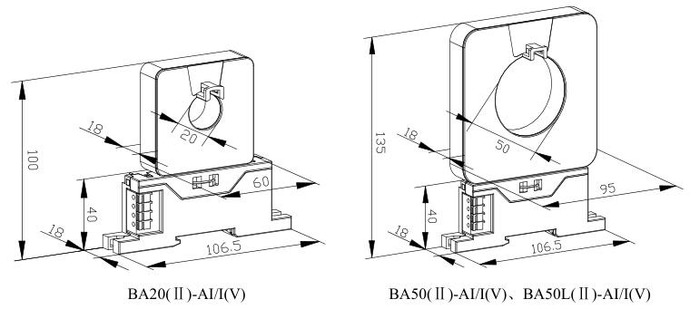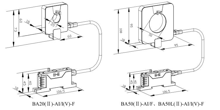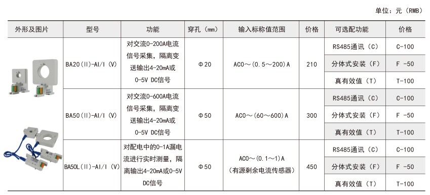 智能型BA系列電流傳感器應用電磁感應原理,對電網中的交流電流進行實時測量,采用恒流和線性補償技術,將其隔離變換為標準的直流信號輸出,或通過RS485 接口(Modbus-RTU 協議)將測量數據進行傳輸。DC24V 或12V 安全電壓供電,可廣泛用 于工業自動化領域。BA50L(Ⅱ)-AI 為交流剩余電流互感器,主要檢測用電系統的漏電流,能隨時掌握電氣線路和設備的情況,防止因漏電而發生的火災等事故。