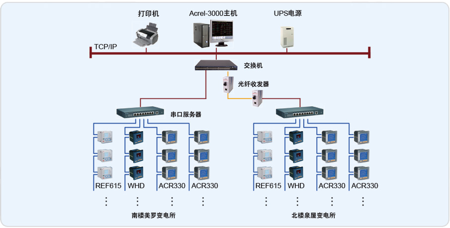 該系統(tǒng)總計(jì)有352只儀表(其中包括330只ACR網(wǎng)絡(luò)多功能電力儀表,12只ABB綜合保護(hù)裝置,10只變壓器溫控儀),分20條總線,其中北樓泉屋變電所8條總線,南樓美羅變電所12條總線,兩變電所之間距離較遠(yuǎn),采用光纖組網(wǎng)連接,再通過網(wǎng)線拉至南樓美羅變電所值班室連接到監(jiān)控主機(jī)實(shí)現(xiàn)總線上儀表與監(jiān)控主機(jī)的數(shù)據(jù)連通。