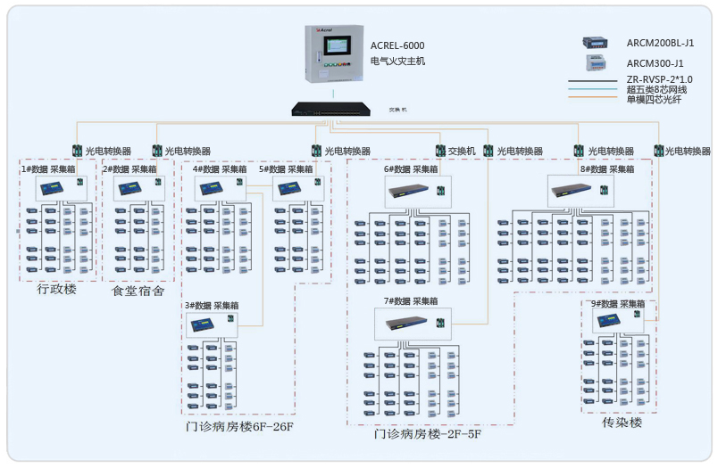 系統(tǒng)采用Acrel-6000電氣火災監(jiān)控系統(tǒng),整個系統(tǒng)采用網(wǎng)絡(luò)分布式結(jié)構(gòu),監(jiān)控主機位于消控中心值班室門診一層,其余9個數(shù)據(jù)采集箱分布在行政樓、門診病房樓、食堂宿舍樓、感染樓,現(xiàn)場采用安科瑞ACRM系列漏電火災儀表。所有監(jiān)控設(shè)備均通過屏蔽雙絞線至各自數(shù)據(jù)采集箱的通訊管理機,再通過光電轉(zhuǎn)換器經(jīng)過光纖將數(shù)據(jù)傳輸至消控中心值班室門診一層,從而實現(xiàn)遠程監(jiān)控。
