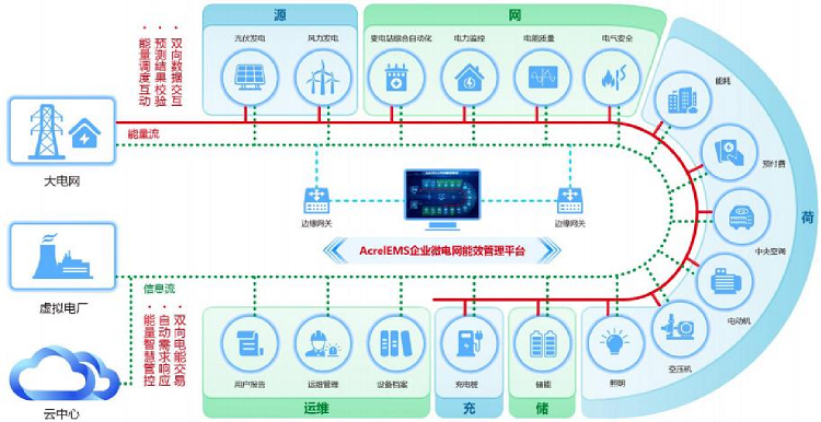 AcrelEMS 3.0智慧能源管理平臺對企業微電網分布式電源、市政電源、儲能系統、充電設施以及各類交直流負荷的運行狀態實時監視、智能預測、動態調配,優化策略,診斷告警,可調度源荷有序互動、能源全景分析,滿足企業微電網能效管理數字化、安全分析智能化、調整控制動態化、全景分析可視化的需求,完成不同策略下光儲充資源之間的靈活互動與經濟運行,為用戶降低能源成本,提高微電網運行效率。