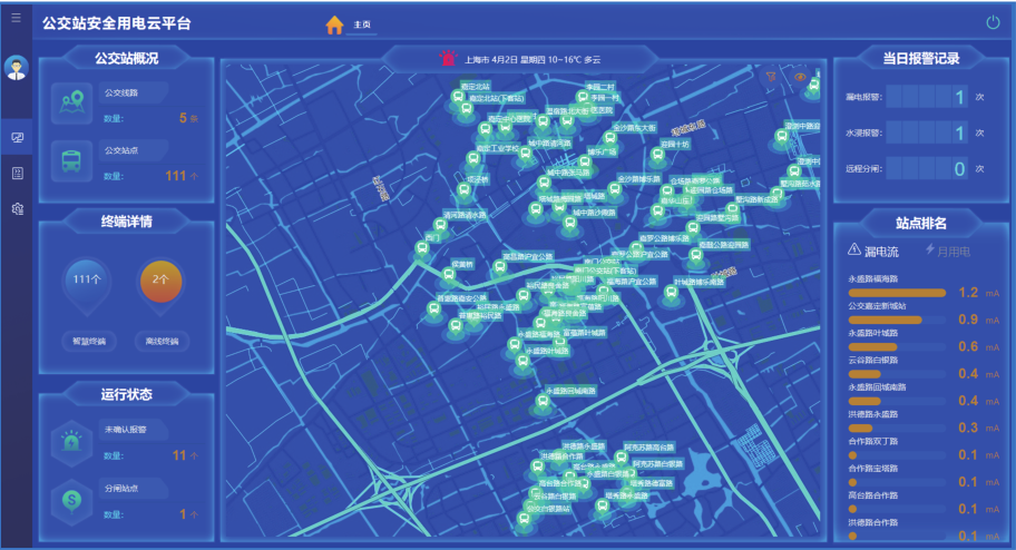 安裝在城市各個公交站臺的安全用電監測終端實時監測公交站運行情況,包括配電漏電流大小、水浸狀態、電能等,管理人員可通過瀏覽器或APP實時掌握運行 狀態;
