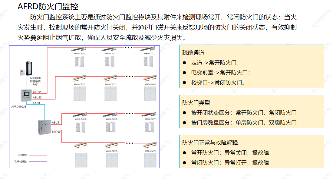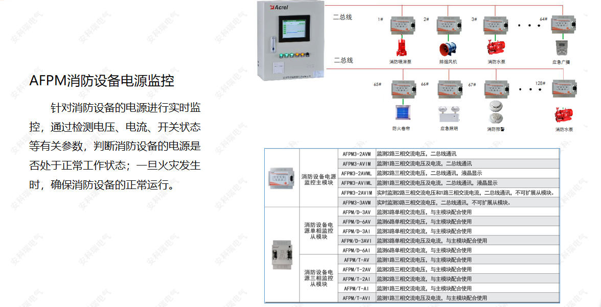 可對配電系統(tǒng)回路的漏電電流和線纜溫度進(jìn)行實(shí)時監(jiān)測,實(shí)現(xiàn)安全預(yù)警。 另外還可以接入消防設(shè)備電源監(jiān)控系統(tǒng)、防火門監(jiān)控系統(tǒng)、應(yīng)急照明及疏散指示系統(tǒng)的報警信息。