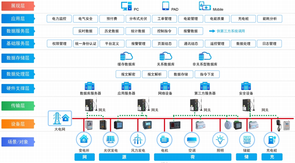 為平臺主界面,針對于企業(yè)微電網(wǎng)的源、網(wǎng)、荷、儲、充的各個關(guān)鍵節(jié)點(diǎn)安裝監(jiān)測、分析、保護(hù)、治理裝置, 通過高性能邊緣計(jì)算網(wǎng)關(guān)采集數(shù)據(jù)并上傳至企業(yè)微網(wǎng)平臺。平臺根據(jù)新的電網(wǎng)價格、用電負(fù)荷、電網(wǎng)調(diào)度指令等情況, 調(diào)整各系統(tǒng)控制策略并遠(yuǎn)程下發(fā),使企業(yè)微電網(wǎng)始終高效穩(wěn)定運(yùn)行,降低企業(yè)用電成本,實(shí)現(xiàn)能源互聯(lián)、信息互動。