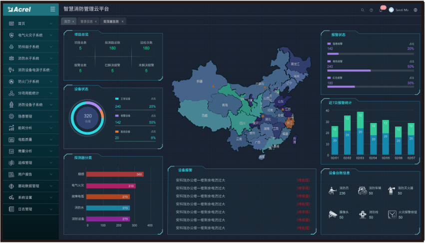 主要展示的內(nèi)容有:項目概況、設(shè)備狀態(tài)、探測器分類、設(shè)備報警信息、報警分類、報警統(tǒng)計、設(shè)備臺賬信息等。其中百度地圖可以選配成3D建筑模型。